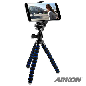 The MG2TRIXL Flexible 11” Tripod with Universal Smartphone Holder fits: the Apple iPhone 6S Plus, iPhone 6S, 6, 5S, 5C, and 4S, Samsung Galaxy Note 5, Note 4, and Note 3, Galaxy S6 edge+, S6, S5, S4, and S3, LG G4, G3, and G2, Google Nexus 6 and Nexus 5, HTC One M9, One M8, and One Max, Nokia Lumia 1520 and 1020, Amazon Fire Phone, Motorola Moto G, and Moto X. The tripod mount is also compatible with small and medium sized digital cameras with the standard 1/4”-20 camera pattern, including the Gear-Pro High-Definition Sport Action Camera, Sony Action Cam, Sony POV HD Flash Memory Camcorder, Canon EOS Rebel T5 and PowerShot, and Nikon COOLPIX and D40. This unique tripod mount includes Arkon’s Mobile Grip 2 Universal Smartphone Holder and the Flexible 11” Tripod with handy carrying pouch. (Cameras and phones not included.) Use the flexible tripod mount/phone holder package in one of two ways: 1) Attach a digital camera directly to the flexible tripod by screwing it onto the 1/4”-20 mounting bolt, or 2) screw the end of the Mobile Grip 2 Holder directly onto the tripod mount for use with a smartphone (remove the rubber insert on the side of the holder to reveal an industry-standard 1/4”-20 threaded camera mounting pattern for use). Take photos anywhere. Bend the tripod mount’s legs to grab on to fences, poles, and trees. Or, hold up the tripod to get a better shot of the action at concerts, parades, and other public events. The Mobile Grip 2 holder expands to accommodate all smartphones (even those with skins and ruggedized cases) up to 3.6” wide. The holder is just 1.4” high, and is ideal for those who prefer a smaller profile. The holder’s spring-loaded mechanism makes it easy to insert or remove the cell phone from the holder with one hand, yet holds the smartphone securely. Its simplistic yet effective design keeps rear smartphone cameras free for spontaneous pictures or videos.