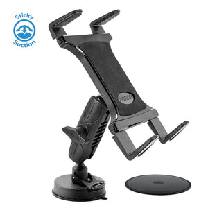 The TABRM079 heavy-duty sticky suction windshield or dash tablet mount is part of Arkon's Robust Mount Series. It holds large tablets having 8.9''-18.4'' screen size, including Apple iPad Pro, iPad Air 2 and iPad Air, iPad 4, 3, and 2, Samsung Galaxy View, Galaxy Note 10.1, Galaxy Note Pro 12.2, Galaxy Tab 4 10.1, Galaxy Tab Pro 10.1 and 12.2, Galaxy Tab S 10.5, Google Pixel C, Nexus 10 and Nexus 9, LG G Pad 10.1, Sony Xperia Tablet Z4 and Tablet Z. This mount includes a heavy-duty sticky suction mounting pedestal and the Slim-Grip Universal Tablet Holder. The mount is ideal for car dashboards, windshields, and other flat or slightly textured surfaces. The Slim-Grip tablet holder features a spring-loaded design that makes it easy to insert or remove the tablet by pushing down on the lower legs of the holder with one hand. Included with the holder are 10 support legs (4 short, 2 medium and 4 long versions). Choose the 4 legs that provide the best fit for your tablet. These insert at the top and bottom of the holder and can be easily adjusted in order to keep any side buttons and ports unobstructed. For most large tablets, the best mount holder configuration is to attach 2 short support legs on top and the 2 long support legs on the bottom of the holder. For smaller tablets, use all 4 short support legs on the holder. For larger tablets including iPad Pro, use all 4 long legs. For vertical viewing, adjust the 360-degree swivel. The tough, low vibration pedestal measures approximately 6.5 inches high from the bottom of the mount base to the top of the mount pedestal (not including holder). The 80mm sticky suction base works well in all climates by using a powerful combination of polyurethane gel and suction to provide a maximum surface bond. In order to prevent permanent indentation marks on soft vinyl, leather, or similar dash surfaces, Arkon recommends using the included 3M adhesive dash mounting disk.