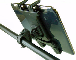 Tablet PC holder is held on a ball & socket attachment which offers 360º swivel & tilt.