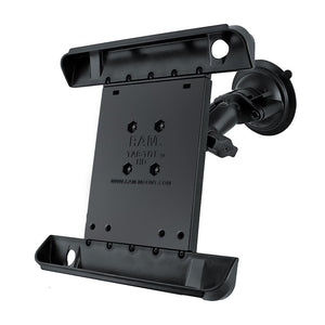 The RAM-B-166-TAB6U consists of a 3.3" diameter suction cup twist lock base, double socket arm, round base adapter and Tab-Tite™ universal clamping cradle. The suction cup base is designed to have a strong hold on glass and non-porous plastic surfaces, including RAM adhesive disks. The mount is designed with a RAM 1" diameter patented rubber ball and socket system that has adjustment points at both ends of the double socket arm; this allowing for almost infinite adjustment and perfect viewing angles. The spring loaded Tab-Tite™ cradle makes it easy to load and unload your tablet, along with keeping it secure while on the go. Interchangeable cup ends are designed to optimize the functionality of your tablet, allowing access to audio jacks, usb, power, and other ports, your tablet can be used just as it was intended. The Tab-Tite™ cradle is compatible with any tablet that will fit the dimensions listed below. It is important to verify the dimensions of your tablet when determining the overall size.
