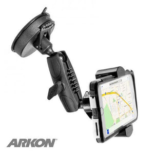 The car mount's solid construction provides strength and reliability on the road by featuring a spring-loaded mechanism that expands to securely grip phone. Arkon recommends using the RoadVise Holder with smartphones with skins and ruggedized cases. Designed to use two hands to install and remove your device. This is to make sure your device cannot be accidentally removed while adjusting viewing angle. The low-profile phone car holder keeps rear smartphone cameras free for spontaneous pictures or videos. The car mount is easy to install. Just snap the holder onto the 17mm ball of the pedestal and use the included tightening ring to secure. The RoadVise car mount attaches onto windshields and features an 80mm TPU suction base that works well in all climates. The arm of the pedestal swivels on both the top and the bottom, providing 360-degree rotation and the ultimate flexibility in positioning the smartphone at any angle. The RV180 also functions as a Garmin GPS mount by simply removing the RoadVise holder and revealing the 17mm ball mount base. It's a solid mount solution that's perfect for your needs.