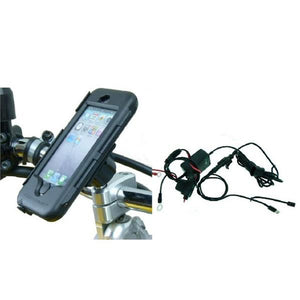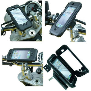 Motorcycle Handlebar Top Clamp M8 Mount comes with the IPX4 waterproof Tough Case designed to hold and protect the Apple iPhone 5C smartphone and a lightening connector motorcycle direct to battery hardwire charger.