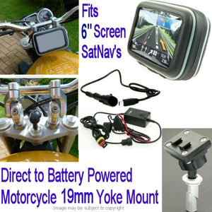 6" screen GPS SatNav motorcycle yoke mount & direct to battery hardwire charging cable with straight mini USB connector.