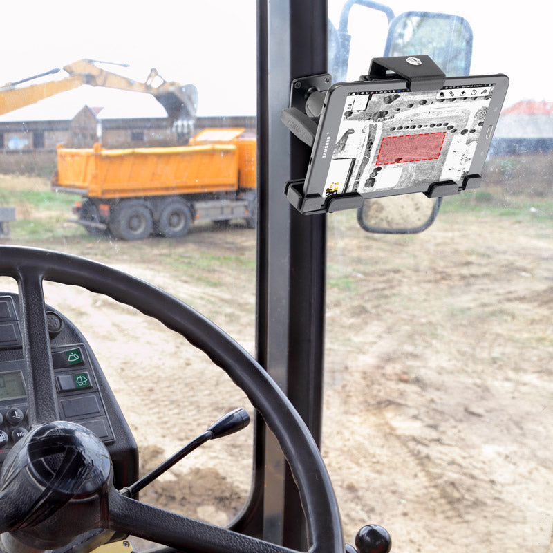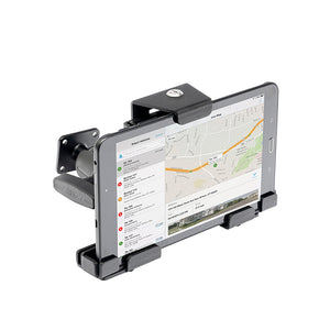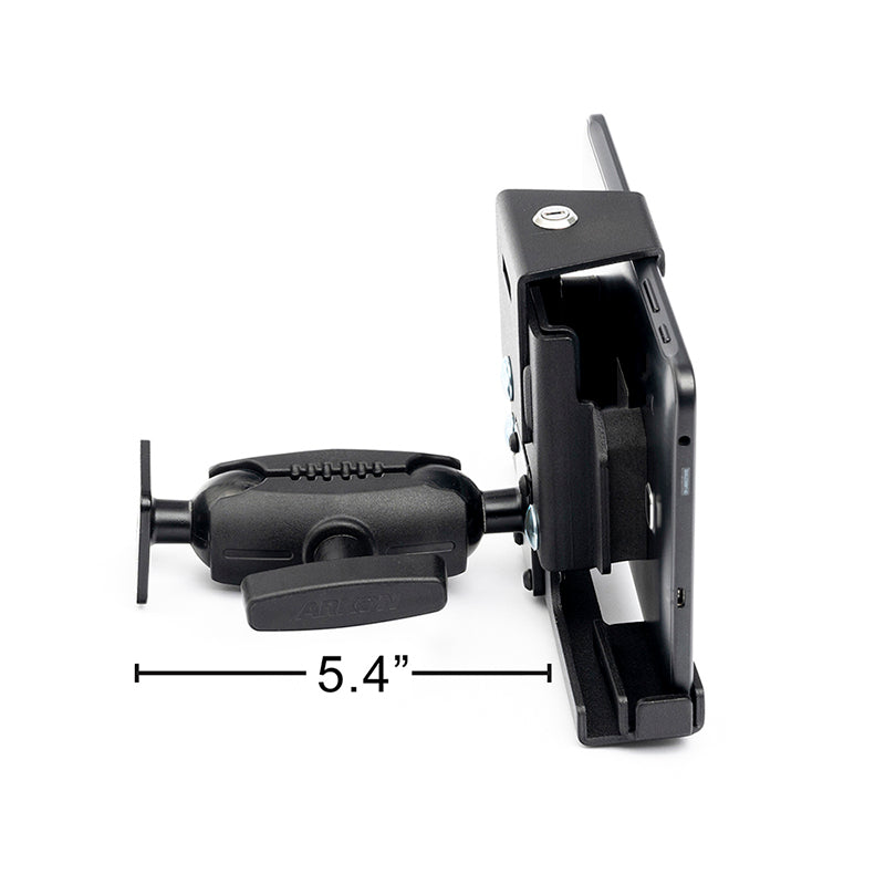 Arkon’s TAB4352XMAMPS Locking Tablet Mount is compatible with 7 to 10 inch tablets, including Samsung Galaxy Tab S Series, Samsung Galaxy Note, Samsung Galaxy Tab Pro, Samsung Galaxy Tab 3, Samsung Galaxy Tab A, Apple iPad, Apple iPad Pro, Apple iPad Air, Amazon Fire Series, Microsoft Surface Pro, and Microsoft Surface Go 2. This sturdy aluminum locking tablet mount is ideal for using with a portable electronic logging device (ELD) in order to comply with the ELD E-Log mandate for commercial vehicles. It’s also great for fleet vehicles and trucks, where keeping your tablet secure is essential. The mount consists of a metal locking tablet holder with key lock, a 3.5 inch composite 38mm compatible Robust mount shaft arm, and metal 4-Hole AMPS head and base. The mount measures approximately 5.4 inches from end to end. The AMPS mount base can be screwed or drilled into any flat surface (screws not included). The aluminum tablet holder features a key lock that secures the tablet and includes multiple horizontal and vertical adjustment points along both sides of the holder for 7 to 10 inch tablets. Use a 7mm and 10mm socket wrench to adjust the tablet holder to your tablet’s size specifications.