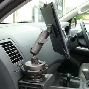 Mount base fits snuggly into a convenient drink / cup holder within your vehicle.