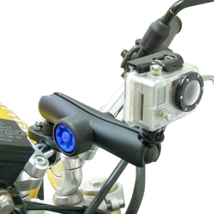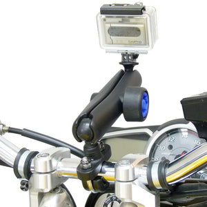 Handlebar U-Bolt 1inch Ball Mount with Security Pin-Lock Long Double Arm and Custom GoPro Hero Adapter.