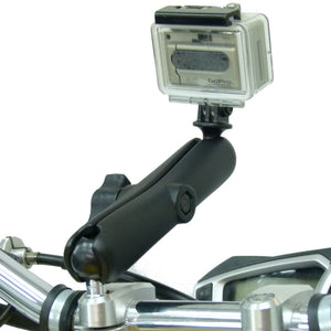 This mount features a handlebar clamp 1inch ball with hole and M8 bolts, a long double socket arm and custom GoPro Hero camera adapter.