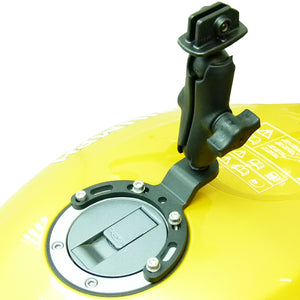 The powder coated aluminium base bolts directly to the stock gas tank of your BMW or Kawasaki motorcycles. Due to it's composition of marine grade aluminium, it is very light, yet strong. The base has a 10cm PCD (Pitch Circle Diameter). We include the hardware you need to mount to the filler cap.