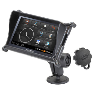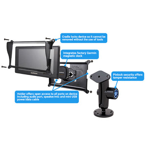 The RAM-B-138-S5-GA66LU consists of a double socket arm, Pin-Lock security knob/key knob with 5-pin pattern, 2.5" diameter round base with the universal AMPS hole pattern, diamond adapter base and custom high strength composite locking case for the Garmin fleet 660/670. The locking case features the ability to secure your Garmin fleet 660/670 in place adding much needed protection and enables full access to the screen, power plug, and memory card slot. The case consists of a front and back cover that can be secured together using standard pop rivets or security screws. The locking case also features a unique cable retention system that prevents accidental unplugging of the USB cable. Paired with a RAM Pin-Lock security knob/key knob, this solution is the ideal accessory for deterring theft or accidental removal of the mounted GPS device.