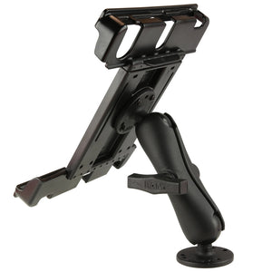 This C size drill-down mount comes equipped with the RAM Tab-Tite holder for 9"-10.5" tablets with a case. This kit consists of two 2.5" diameter round bases that contains the universal AMPs hole pattern, and a C size double socket arm. The mount is designed with a 1.5" diameter patented rubber ball and socket system that has adjustment points at both ends of the double socket arm; allowing for almost infinite adjustment and perfect viewing angles. The rugged double ball and socket mounting system dampens shock and vibration, helping to extend the life of your device.