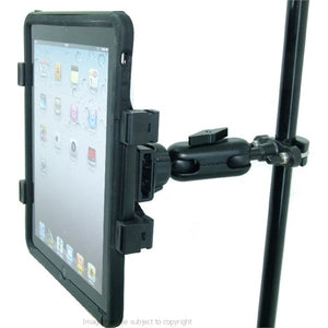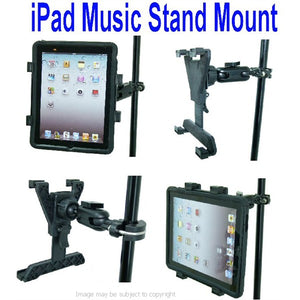 Secure microphone / music stand holder for the Apple iPad 4th generation tablet PC.